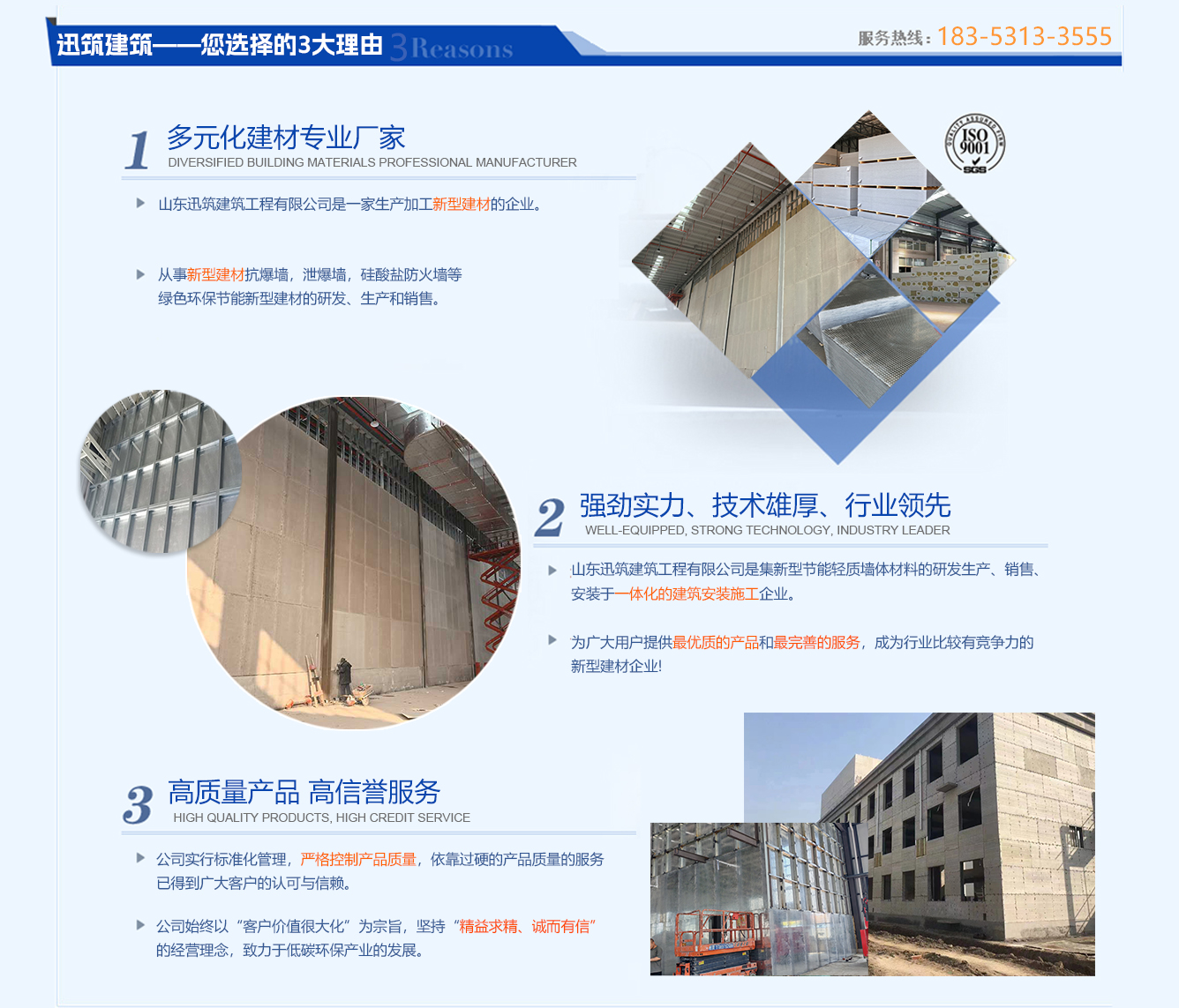 山东迅筑建筑工程有限公司是一家承接抗爆墙,泄爆墙,防火墙的设计施工,以及从事新型节能环保建筑墙体材料的研究、开发、生产、销售、安装为一体的多元化建材企业。从事新型建材、聚苯颗粒轻质隔墙板、硅酸钙板轻质复合墙板、轻质隔墙板,蒸压加气混凝土墙板,空心板等绿色环保节能新型建材的研发、生产和销售,并根据市场情况拟继续扩大其投资规模和领域。公司以产品的人性化设计为特色,使公司产品广泛应用于建筑领域中,成为行业有竞争力的...